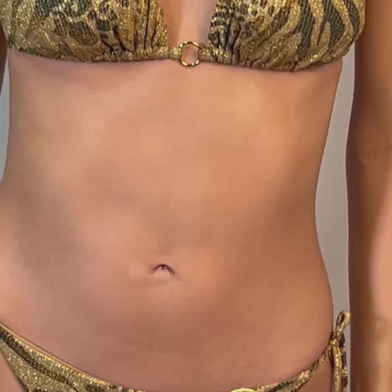 Un classico intramontabile dal fascino elegante e sensuale. Questo bikini Luli Fama a triangolo scorrevole in raffinata texture a stampa animalier dai riflessi dorati è decorato da un anellino al centro.