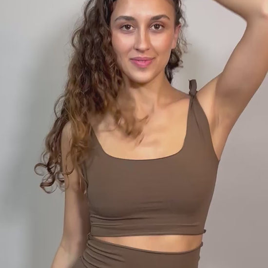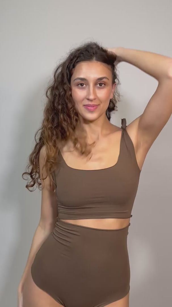 Bikini donna in pregiato cotone tinto naturalmente composto da reggiseno a top, senza struttura interna, con bretelle regolabili annodabili sulla spalla e da slip a vita alta il tutto caratterizzato da taglio a vivo.