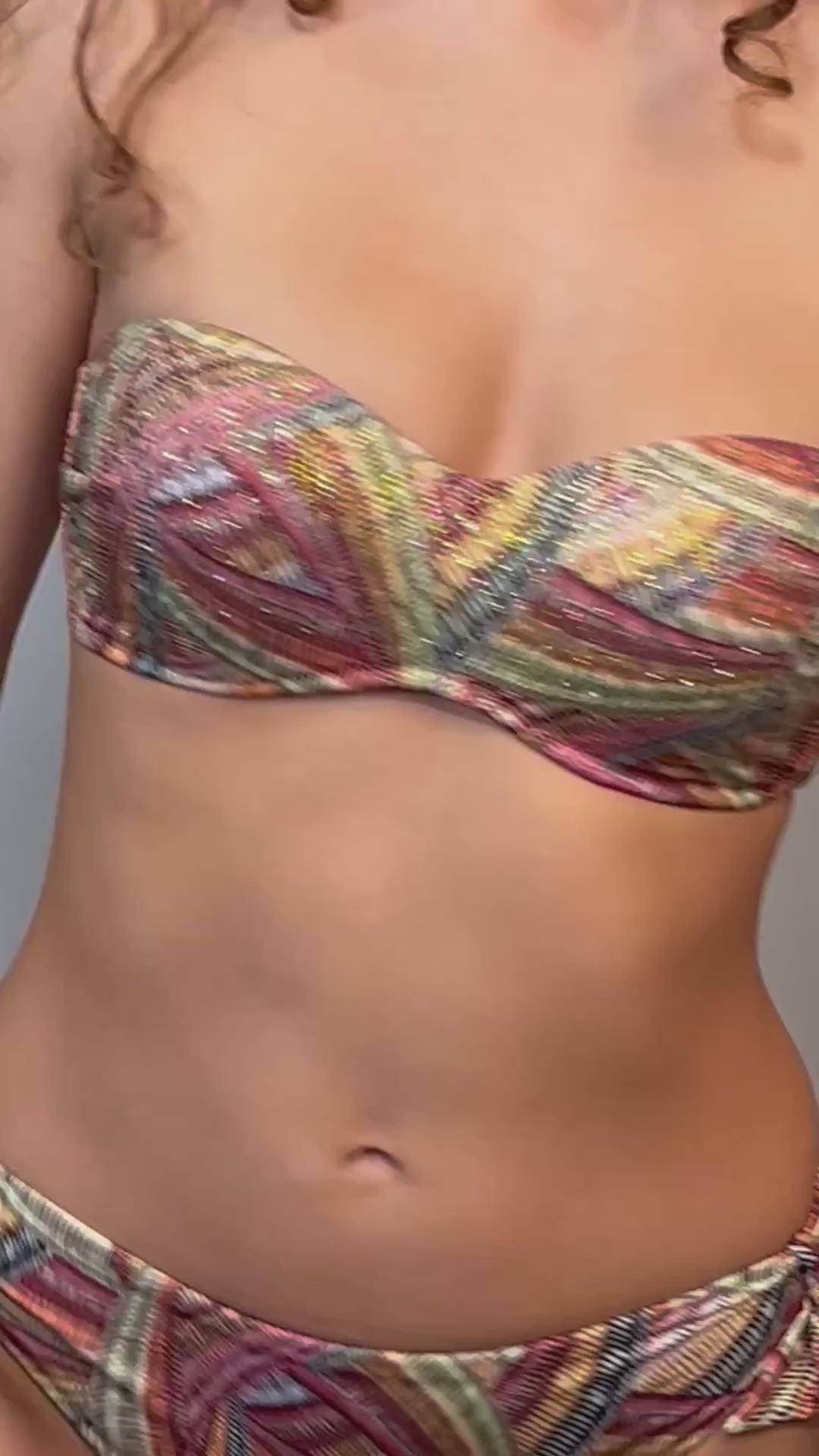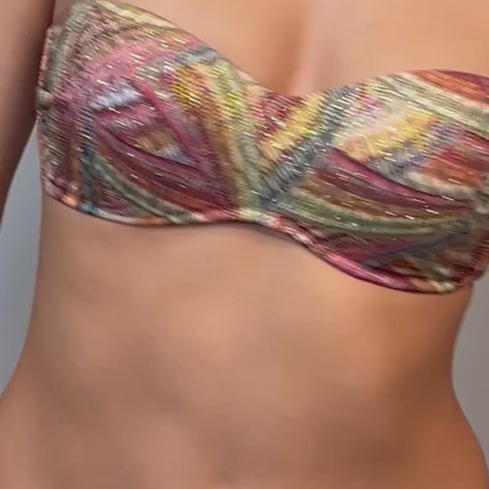 Bikini a fascia preformata multicolore impreziosita da un delizioso motivo con brillantini colorati che si annoda dietro alla schiena. Slip regolare con fiocchi per regolarne la vestibilità.