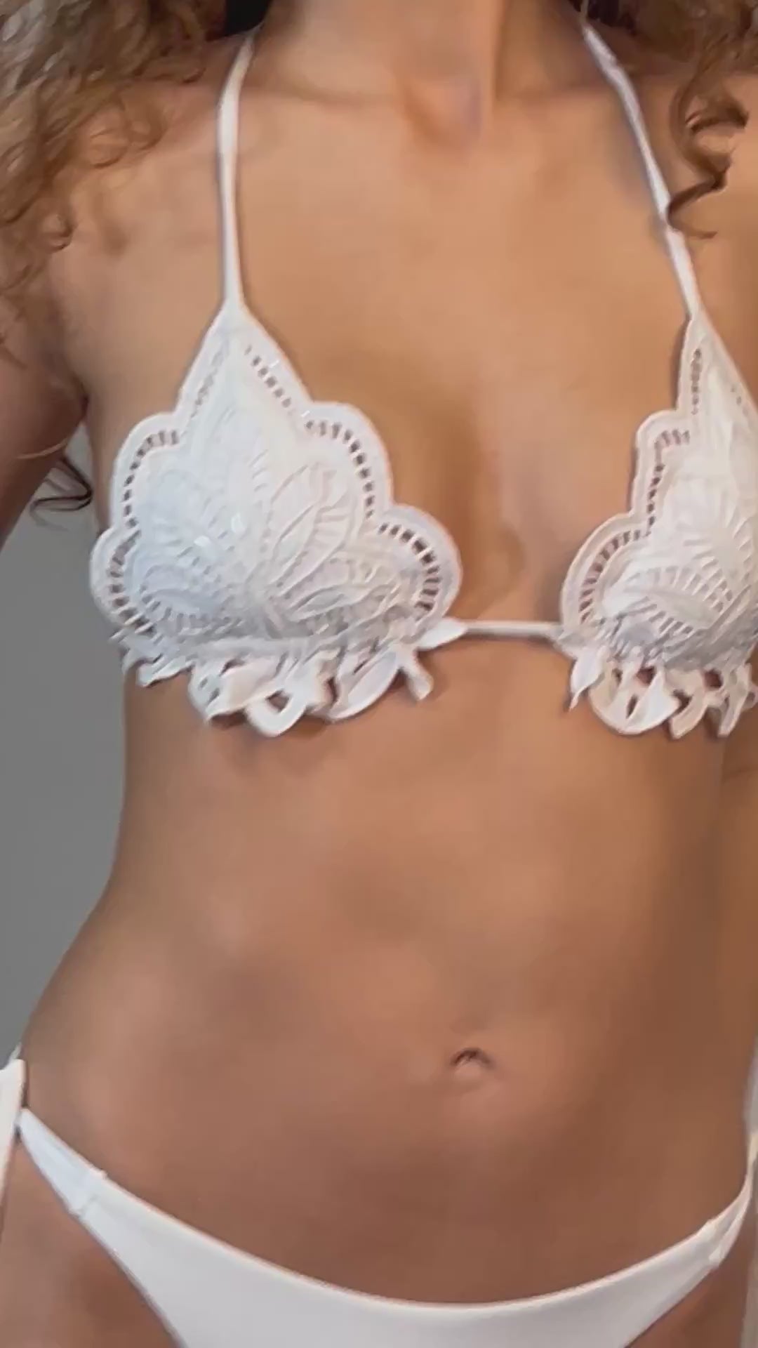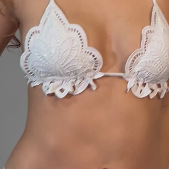 Il top a triangolo valorizza il décolleté con una linea naturale ed è impreziosito da un importante ricamo sagomato che ne definisce il profilo, dotato di leggera imbottitura removibile.