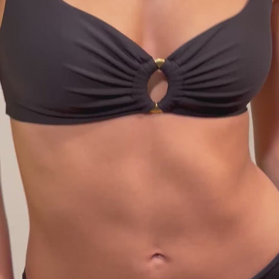 Bikini con reggiseno a brassiere con anello al centro del decoltè, si allaccia sul retro con nodo abbinato a slip regolare a vita leggermente alta.