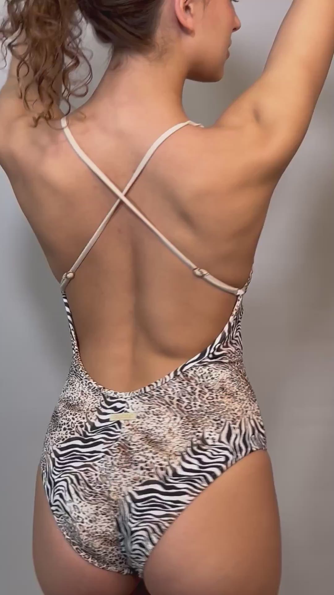 Costume da bagno intero con scollo a v realizzato in morbida lycra che modella leggermente la figura donando un effetto snellente. Reggiseno con leggera imbottitura ed elastico sottoseno e slip regolare con taglio centrale.