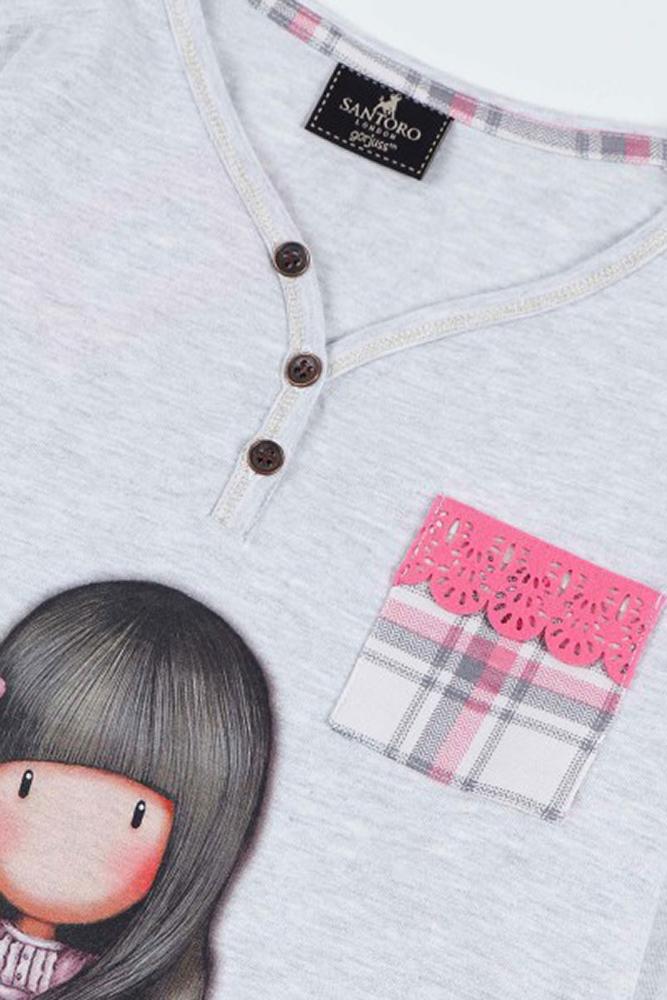 PIGIAMA RAGAZZA - SANTORO GORJUSS Pigiama manica lunga con collo a serafino, realizzato in caldo cotone, con stampa bambola Santoro e taschino decorato applicato sul fronte. Pantaloni a scacchi con elastico in vita. Composizione: 98% Cotone; 2% Poliestere. Consigliato lavaggio a 30°C