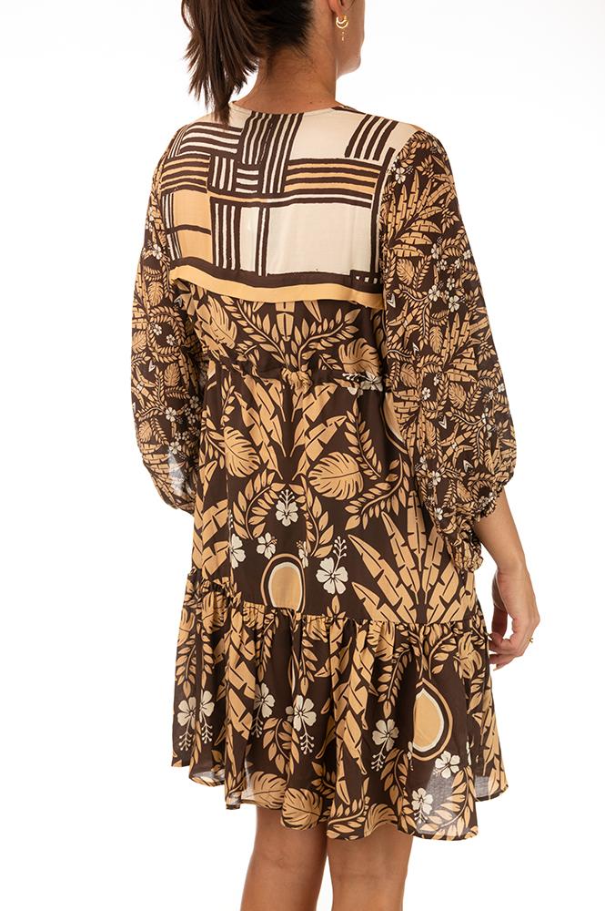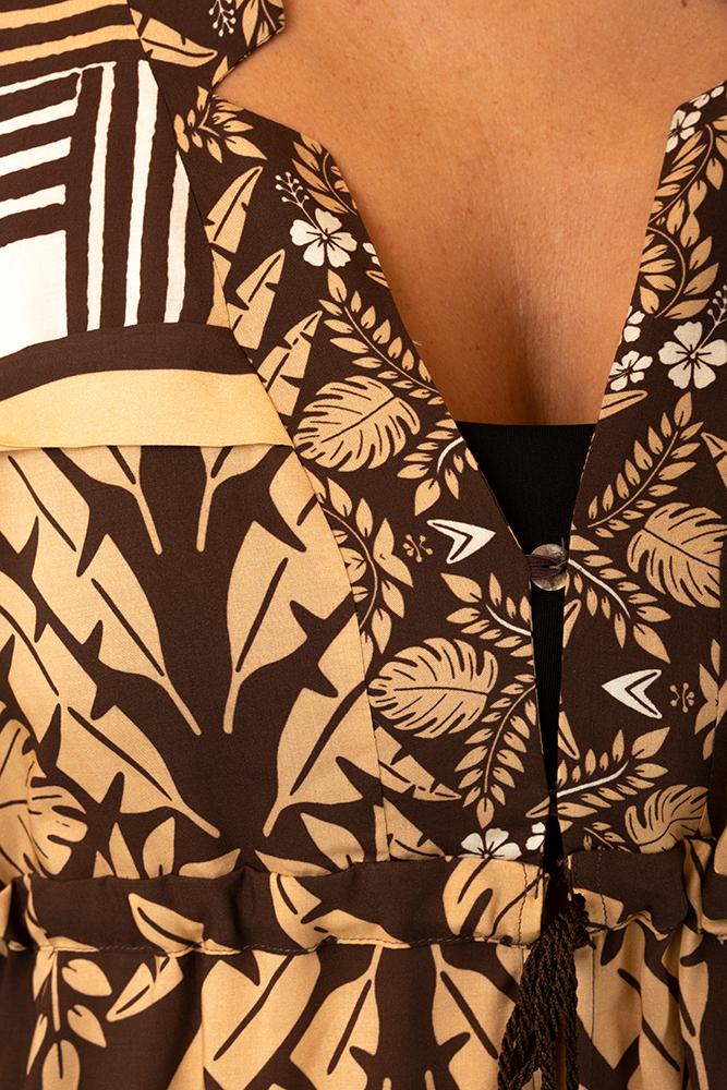Caftano corto con scollo a V, manica ¾ a palloncino, coulisse sottoseno realizzato in Viscosa stampata a fantasia con balza arricciata sul fondo.